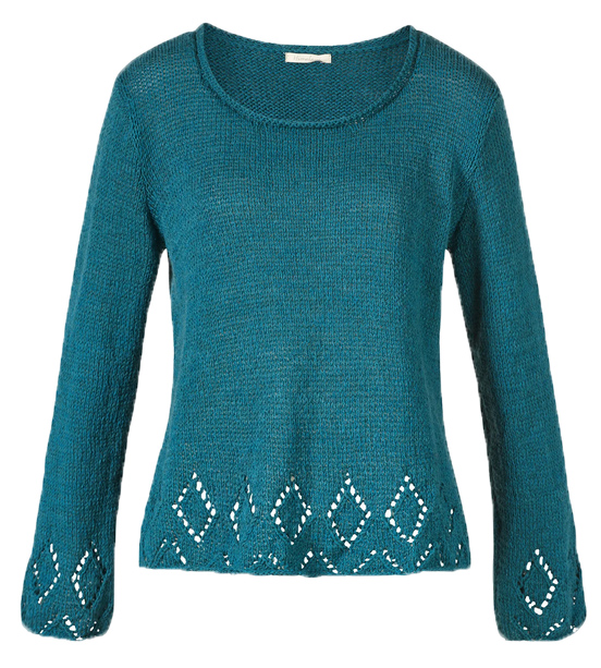 Ein in ausdruckstarkem Petrolblau gehaltener Strickpulli in einer edlen Materialmischung aus 65% Wolle und 35% Seide. Runder Halsausschnitt, dezente Trompetenärmel und ein hübsches Muster an Bund und Ärmelabschlüssen. Handwäsche empfohlen, zum Trocknen auflegen!