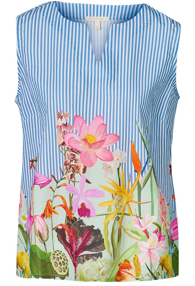 Eine ärmelloses Top, gefertigt aus 100% tragefreundlicher Baumwolle. Auf einem hellblau-weißen Streifenprint leuchtet ein tropischbuntes Blumenbukett, das den Sommer wiederspiegelt. Feinwäsche 30°.