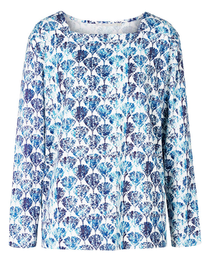 Ein langärmeliges Shirt mit leicht eckigem halsnahen Ausschnitt. Es ist hellblau im Batikstyle gemustert und durch seine unregelmäßige Farbstruktur besonders attraktiv! Auch das in ungewöhnlichem Blau gemusterte Farnmuster macht einen besonderen Effekt! Material: 95% Ecovero mit 5% Elasthanbeigabe. 30° Feinwäsche.