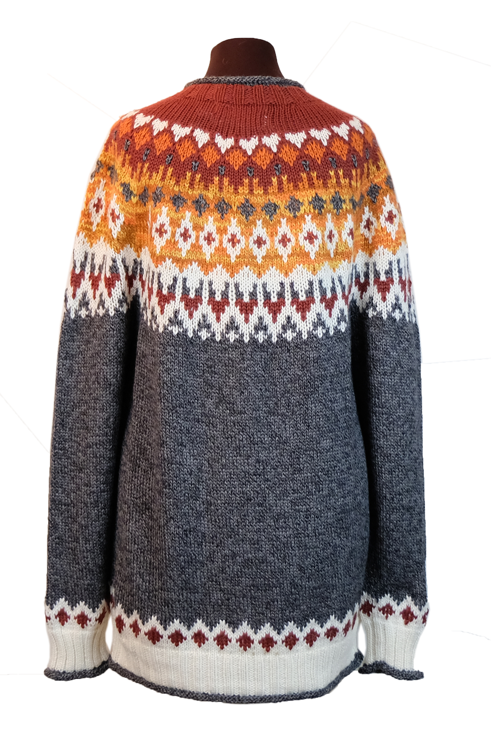 Strickpullover aus 100% peruanischer Alpakawolle. Klassisches Norwegermuster, in der Farbstellung neu interpretiert. Die Grundfarbe ist ein dunkles Athrazit, die Musterbordüre im Oberteil ist rot-weiß-orange. Weitere Abschlußbordüren an Ärmeln und Saumabschluß ist weiß. Hergestellt exklusiv von unserem langjährigen Partnerbetrieb in Peru. Handwäsche bei 20 Grad empfohlen. Das Material ist sehr empfindlich, jedoch gleichzeitig schmutzabweisend, sodaß Lüften in der frischen Luft grossteils das Waschen erspart. Auf keinen Fall in der Maschine waschen! Der Pulli ist aus 100% Alpacawolle gefertigt, von unserem jahrelangen Lieferanten in Peru. Größe M: Brustweite 46 cm, Gesamtlänge 68 cm. Pflege: Reinigung oder Handwäsche in handwarmem Wasser. Ein mildes Waschmittel ist empfehlenswert!