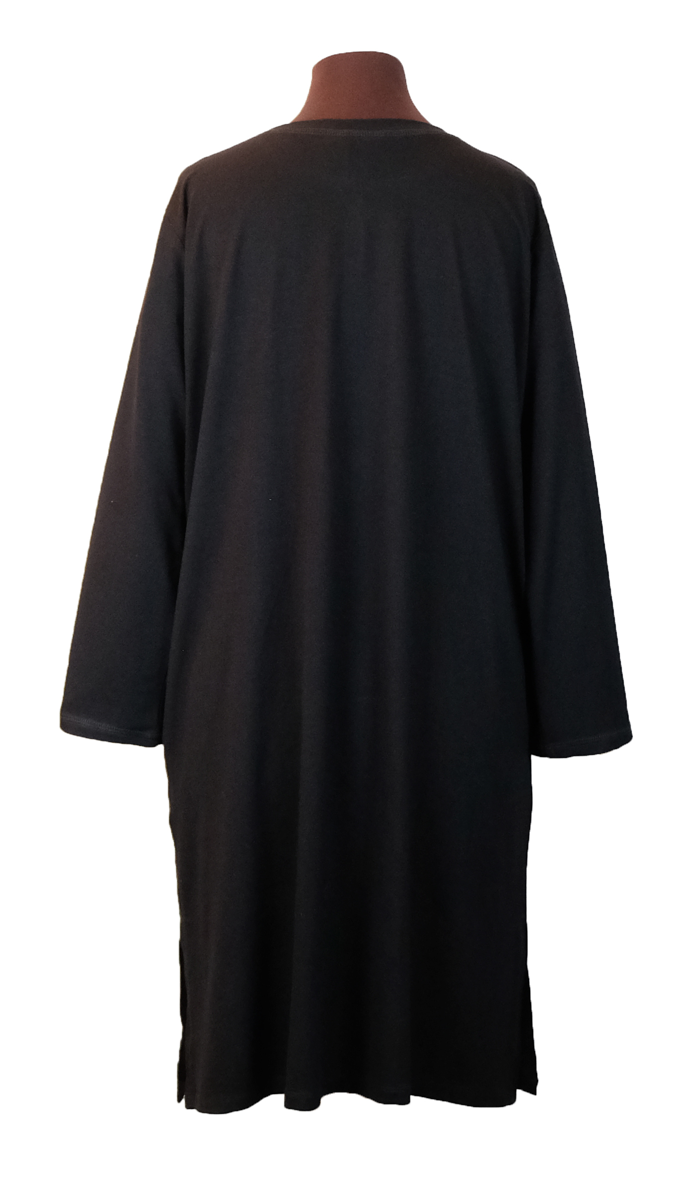 Schlichtes knielanges Langarmkleid. Material: Jersey aus 95% Viskose und 5% Lycra. Farbe: schwarz. Praktische seiltiche Taschen und 13 cm lange Schlitze links und rechts. Einheitgrösse FREESIZE passend bis Konfektiongrösse 44/46. Pflege: 30Grad Maschinwäsche. Nach dem Waschen noch feucht glattstreichen, kein Bügeln notwendig.