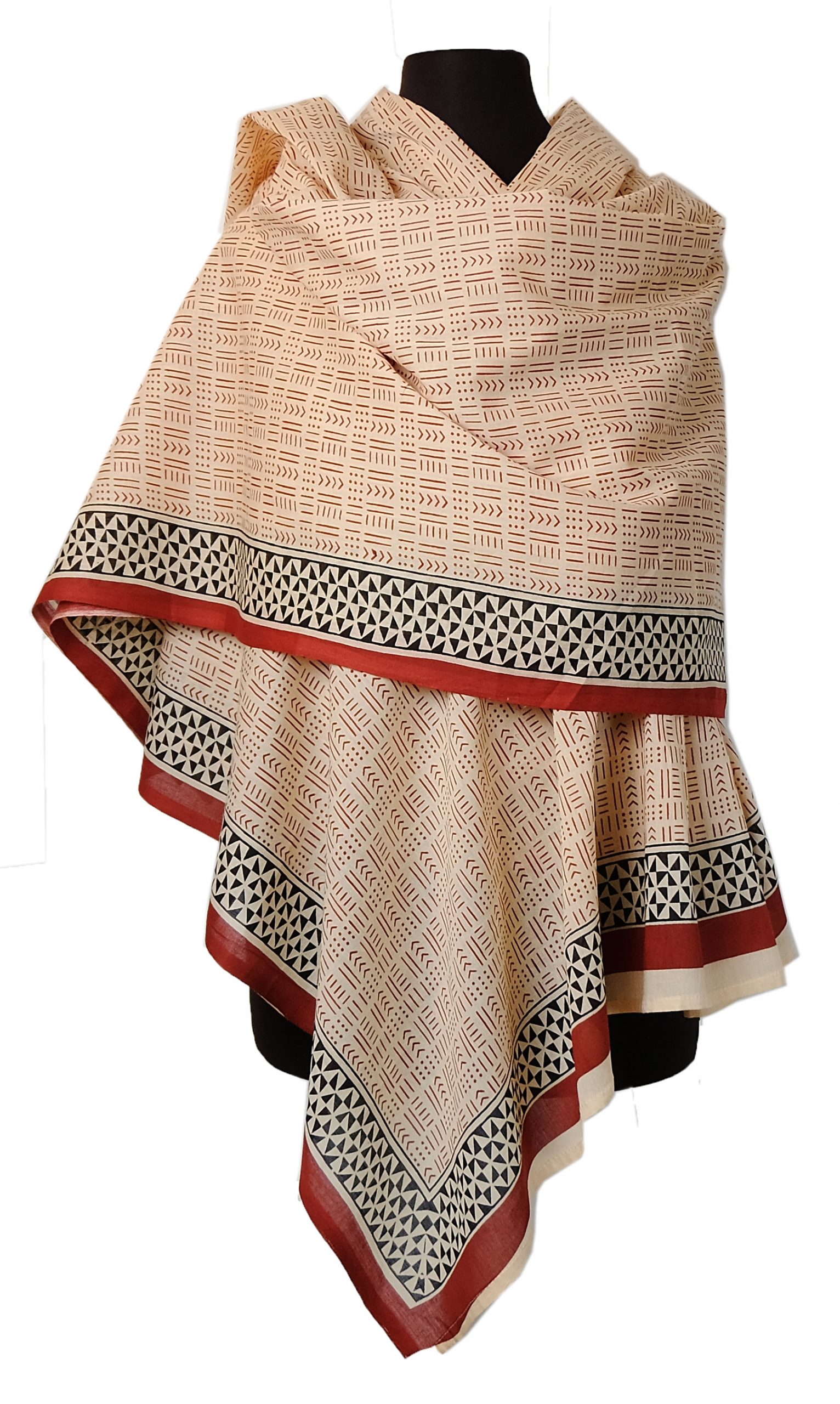Ein edler Shawl mit einem zarten an marokkanisches Kunsthandwerk erinnernden Muster auf cremefabenem Grund. Als Highlight die seitliche farblich kontrastierende Abschlußbordüre. Material 100% Baumwolle. Maße: 100×200 cm.