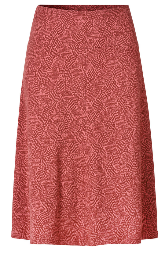 Ein leicht ausgestellter Rock aus festem und gleichzeitig schmiegsamem Jacquardstoff. Breiter abgesetzter Bund, in 4 Bahnen geschnitten. Locker fallend mit einem feinen Allover- Grafikmuster in rot-weiß. Material: 95% Bio Baumwolle mit 5% Elasthananteil, Feinwäsche 30°.