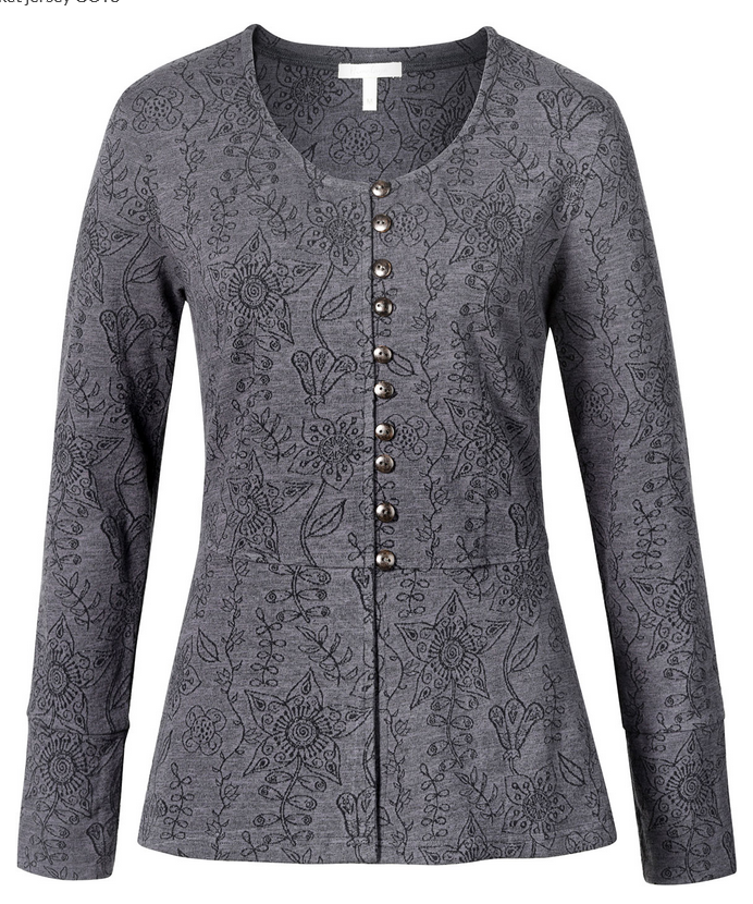 Ein zartes Blumenmuster in anthrazitgrau auf hellgrauem Grund ziert dieses schmal geschnittene Jackenmodell. Taillennaht. darüber eine Knopfleiste mit 10 kleinen Knöpfen. Material: 95% Baumwolle mit % Elasthan. Feinwäsche 30°. Nach dem Waschen zum Trocknen glattstreichen und auf einem Bügel trocknen lassen. Kein Bügeln erforderlich!
