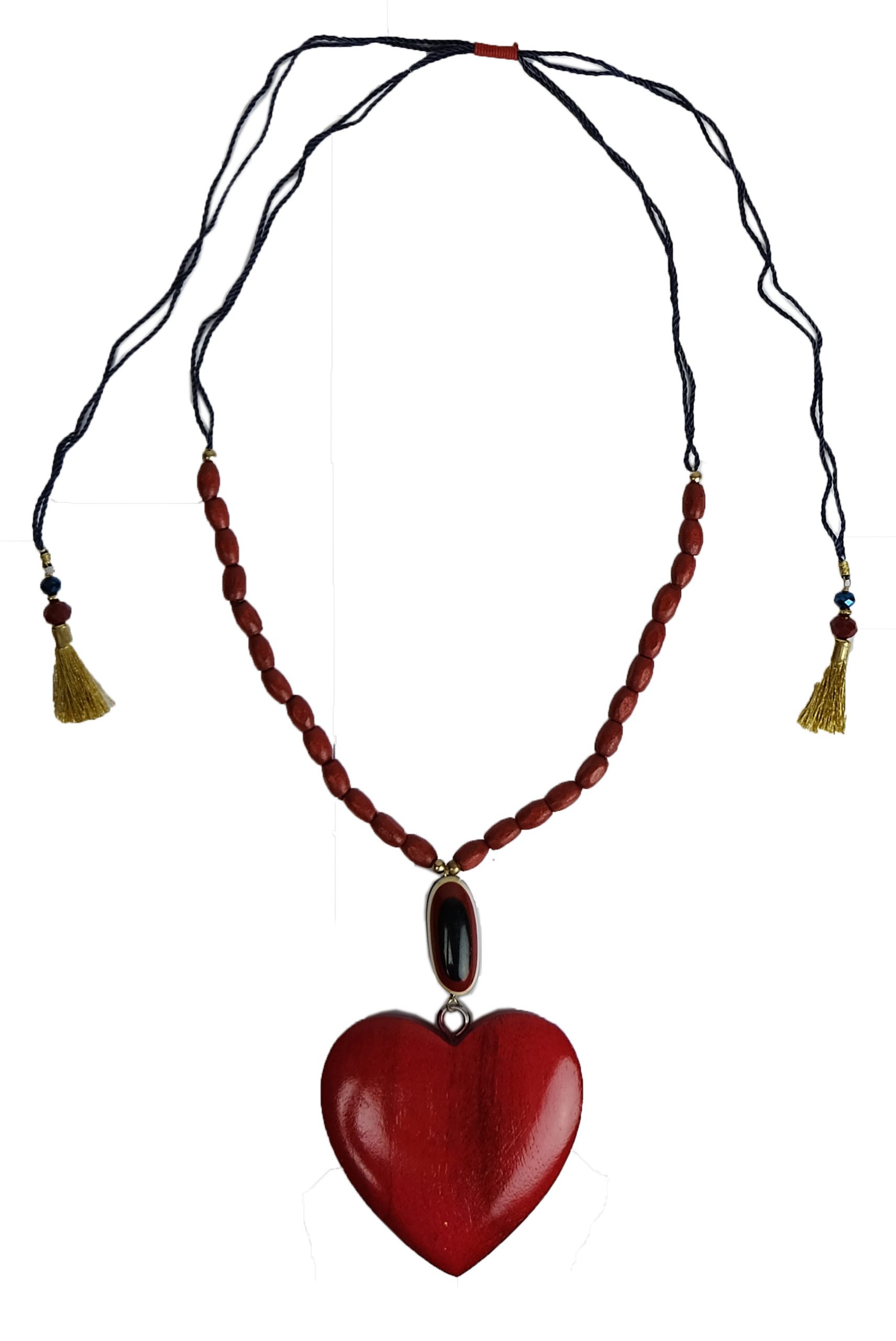 Ein absoluter Blickfang: ein plakativer, ganz besonderer Halsschmuck mit einem roten Herzanhänger und passenden Holzperlen. Material: 100% Mangoholz. Maße: ca.7,5 cm. Verstellbares gewachstes Stoffband!