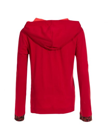Eine hochwertige Kapuzenjacke in einer schmiegsamen Jersey-Qualität (97% Baumwolle mit 3% Lycra). Durchgehender Zipp. Grundfarbe ziegelrot mit einem schwarz gemusterten Printmotiv im Vorderteil und an den Ärmelbündchen. Gesamtlänge in Größe M 62cm, in Größe XXL 70cm. 30 Grad Maschinwäsche.