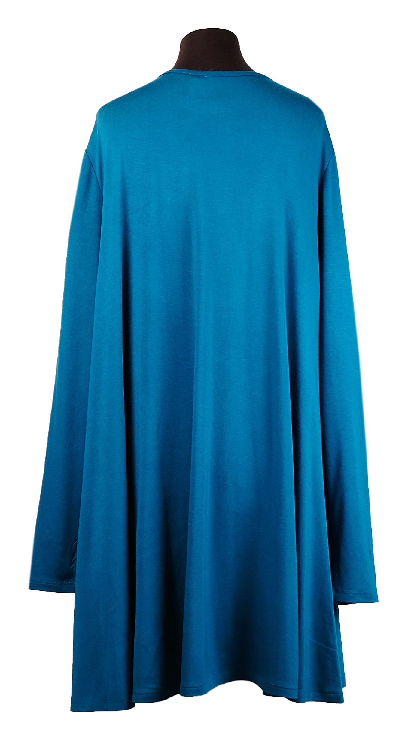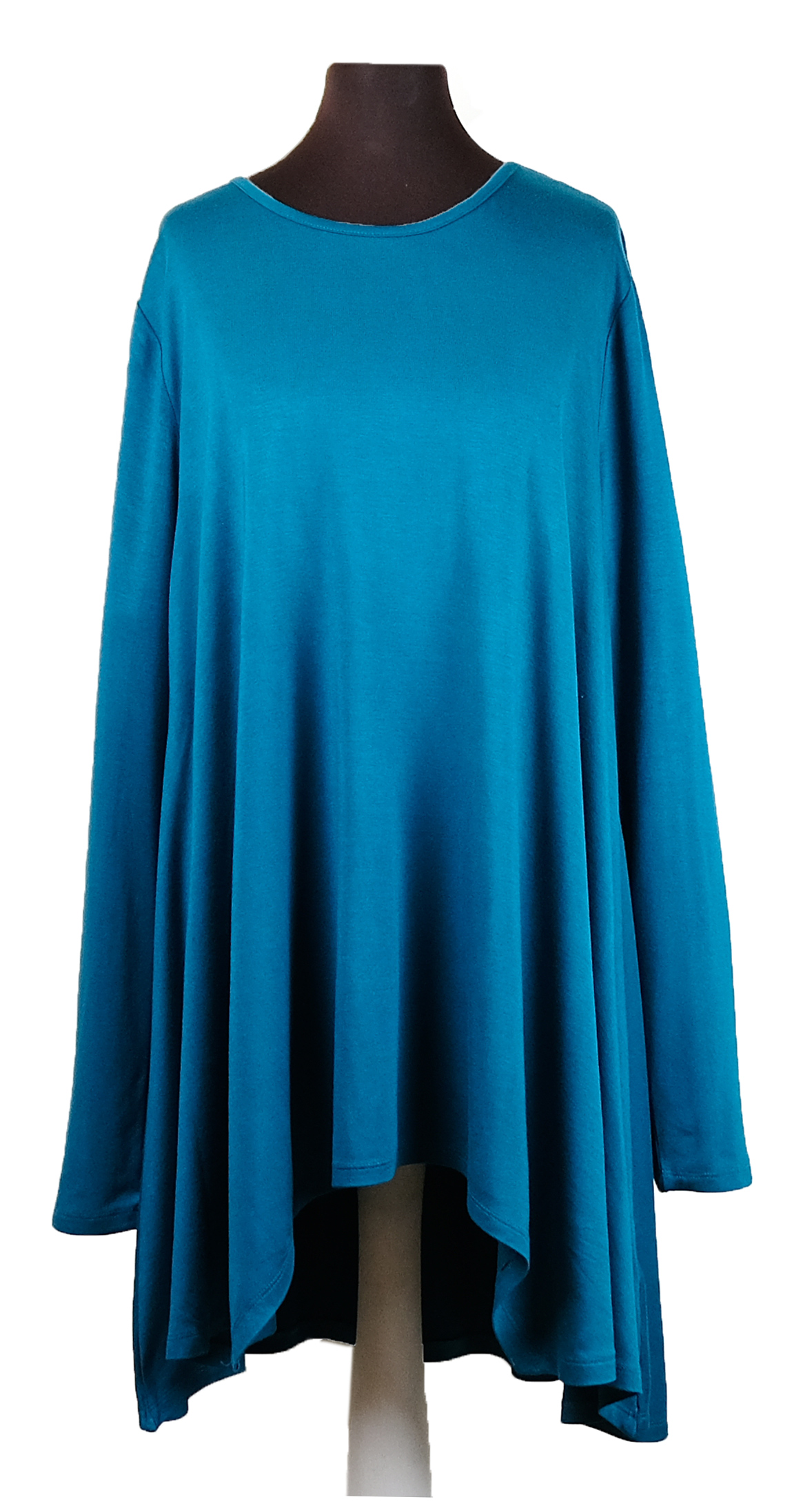 Eine weit geschnittene Oversize Tunika, vorne kürzer und nach hinten verlaufend länger geschnitten: Brustweite Größe M 55 cm, Gesamtlänge: vorne 74 cm, hinten 90 cm. Ideal zu schmalen Hosen und Röcken. Material: eine glatte schön fließende Jerseyqualität aus 95% Viskose mit 5% Lycra. Pflege: Maschinwäsche 30°. Nach dem Waschen glattstreichen und trocknen. Kein Bügeln nötig! Farbe: eine starkes Petrolblau!.