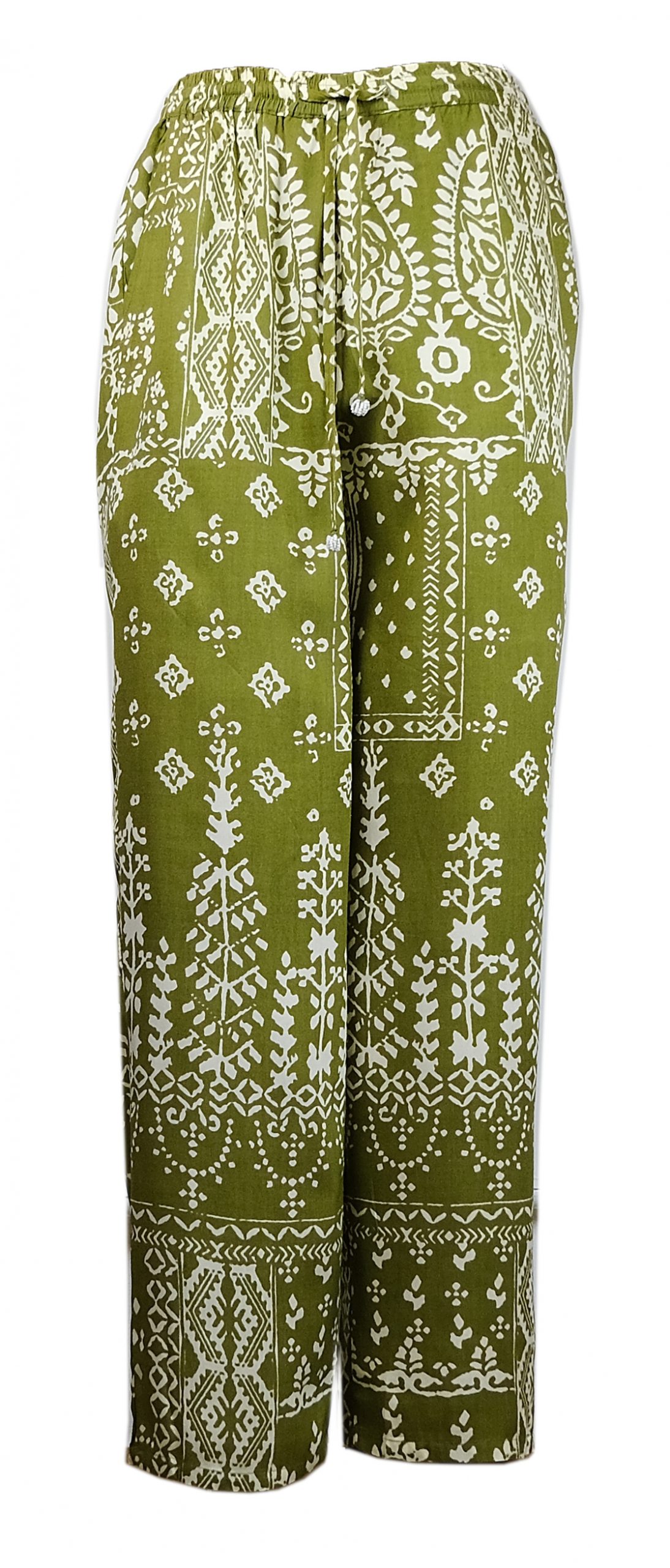 Ein Sommerhit! Eine lange fließende Hose aus 100% leichter Viskose. Der weiss-khakifarbene Mustermix im Batikstil ist sehr ansprechend und gut kombinierbar. Praktisch der elastische Bund mit hübschen Bändern. Gerades Bein. 30° Feinwäsche.