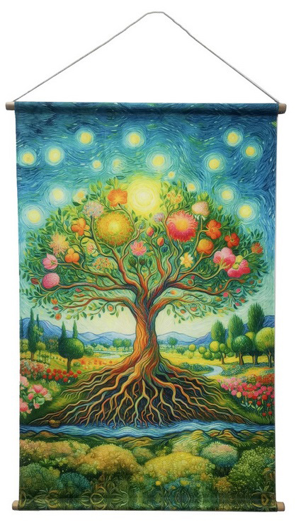Ein phantasievoller Mehrfarbdruck auf Leinwand stellt dieses farbenfrohe Abbild eines Lebensbaums dar. Praktisch auf einer Holzleiste mit Aufhängeband, das mit einem Handgriff leicht anzubringen ist. Maße: 80×2,5x120cm. Ein Blickfang für Ihr Wohnzimmer!