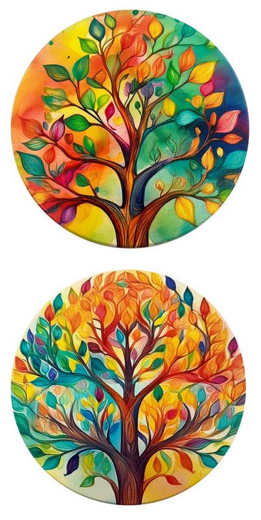 Ein gleichzeitig dekoratives wie praktisches 2-er Set mit verschiedenen Lebensbaummotiven, deren Farb-und Baumgestaltung man nicht widerstehen kann. Sie sind aus Keramik mit einem praktischen Korkunterboden. Durchmesser jeweils 11 cm.