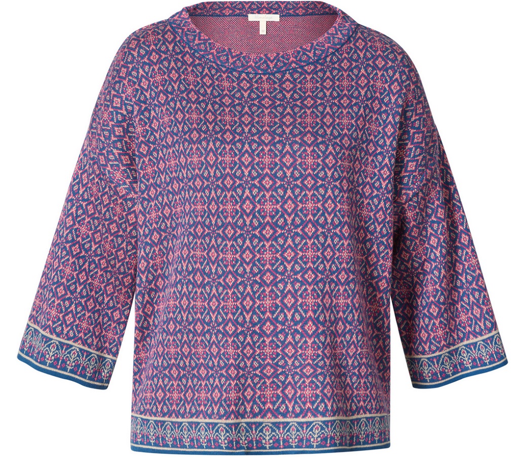 Ein kastig geschnittener modisch Strickpullover in aufwendigem Jacquardstrick. Material: 100% Bio Baumwolle. Hüftlang, gerade schnitten, 3/4 Arm. Das zarte blaulila Muster ist farblich sehr vielseitig und paßt zu vielem. Besonders apart die dezente Musterbordüre rund um Saum und Ärmelabschluß. Feinwäsche 30°.
