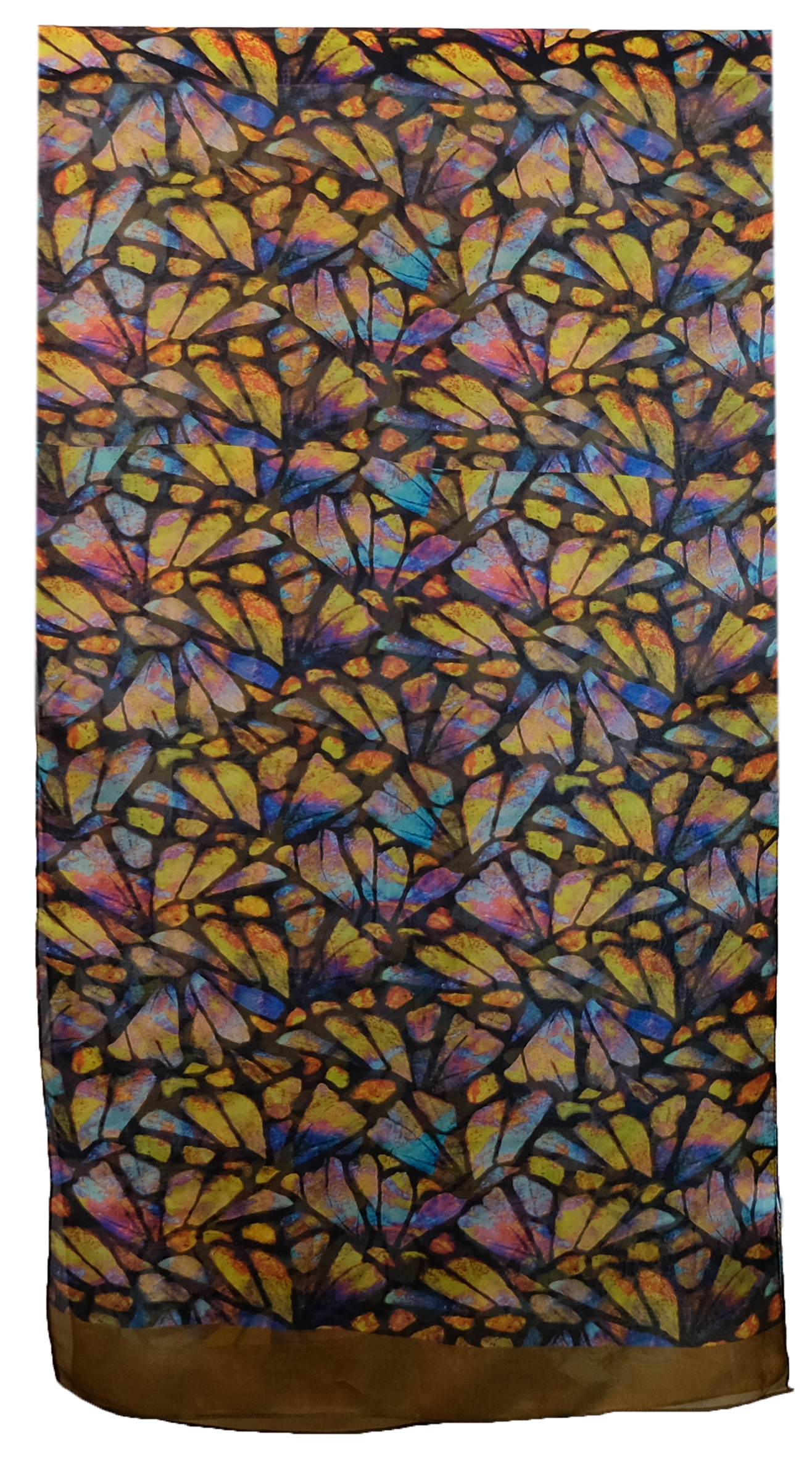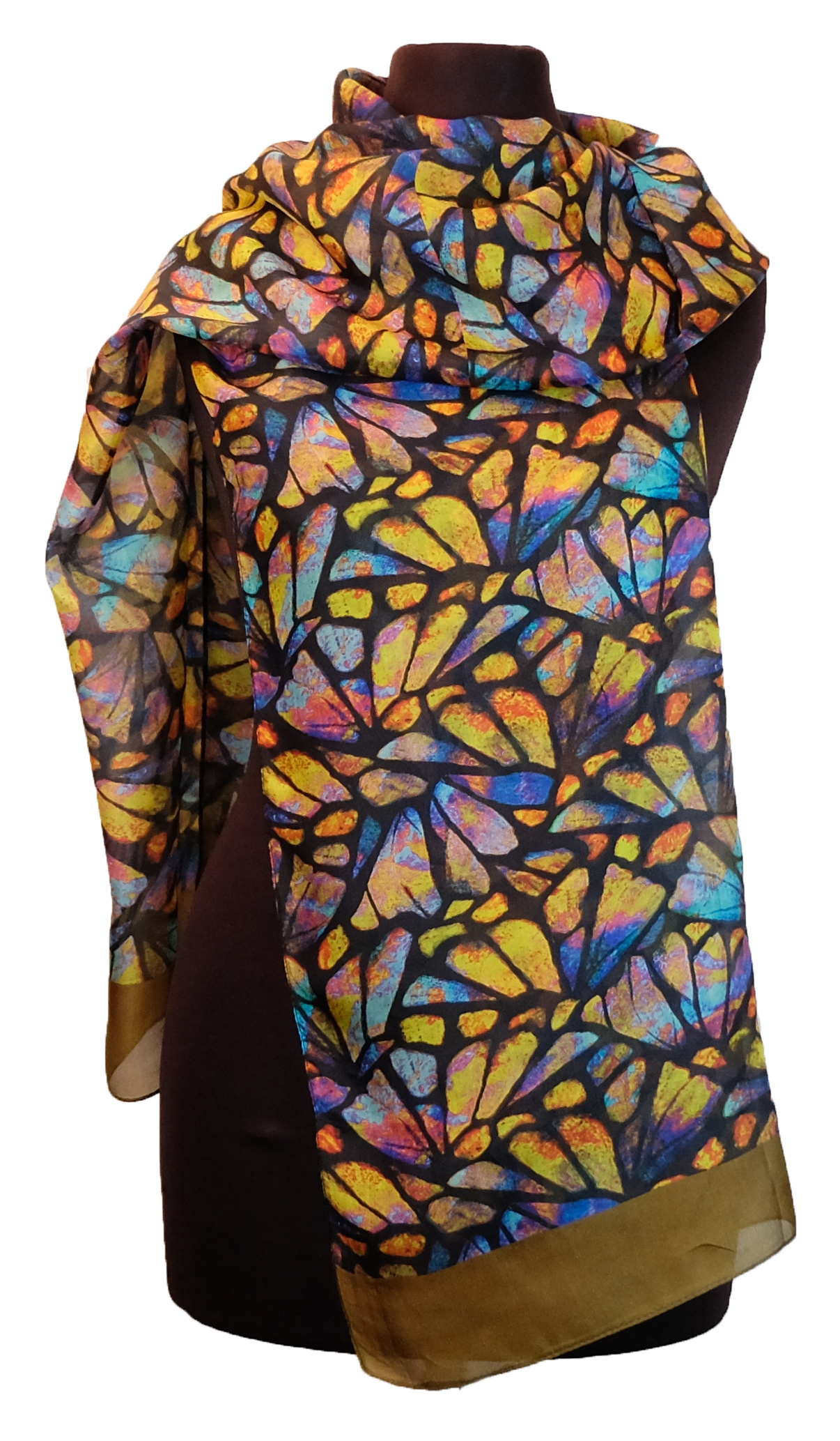 Ein Seidenschal mit einem ausdruckstarken Muster. Grundfarbe schwarz mit einer olivfarbenen Abschlußbordüre. Das bunte Muster erinnert an Schmetterlinge. Maße: 50×180 cm. 100%Seide. Handwäsche 30°.