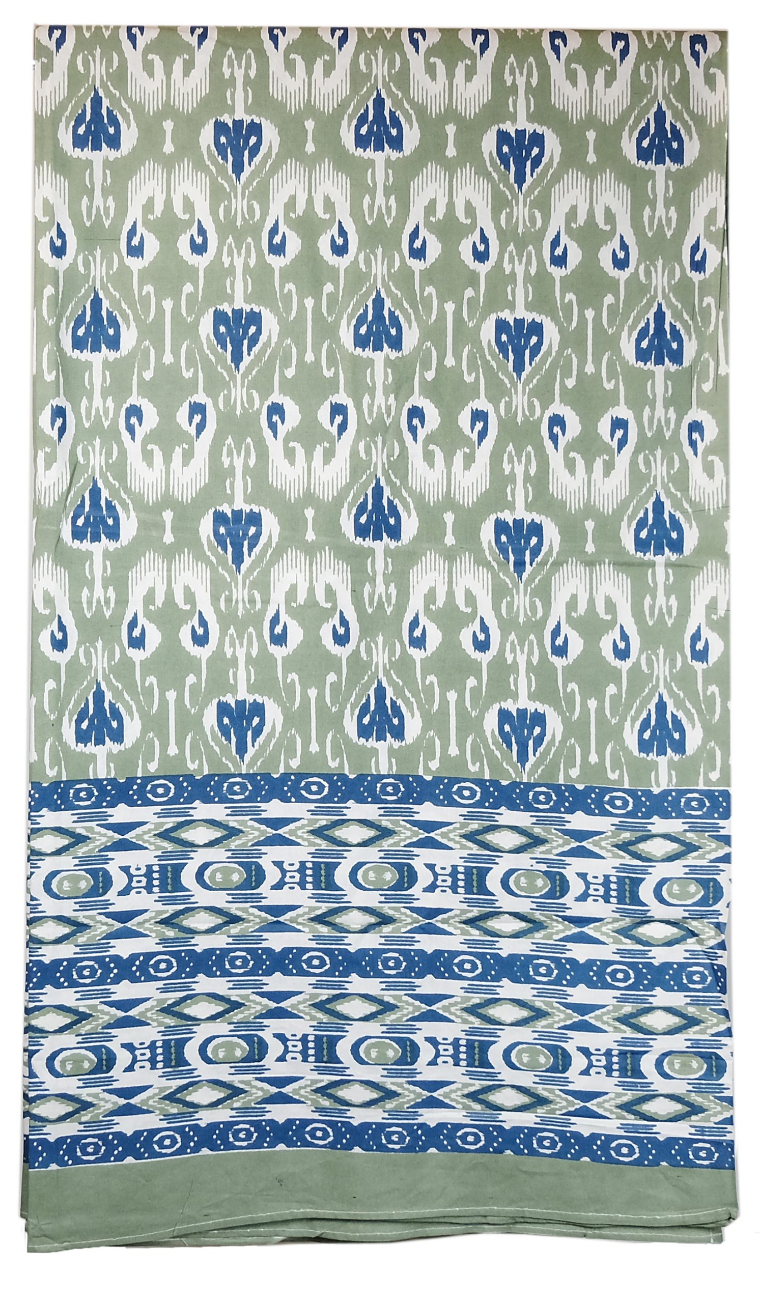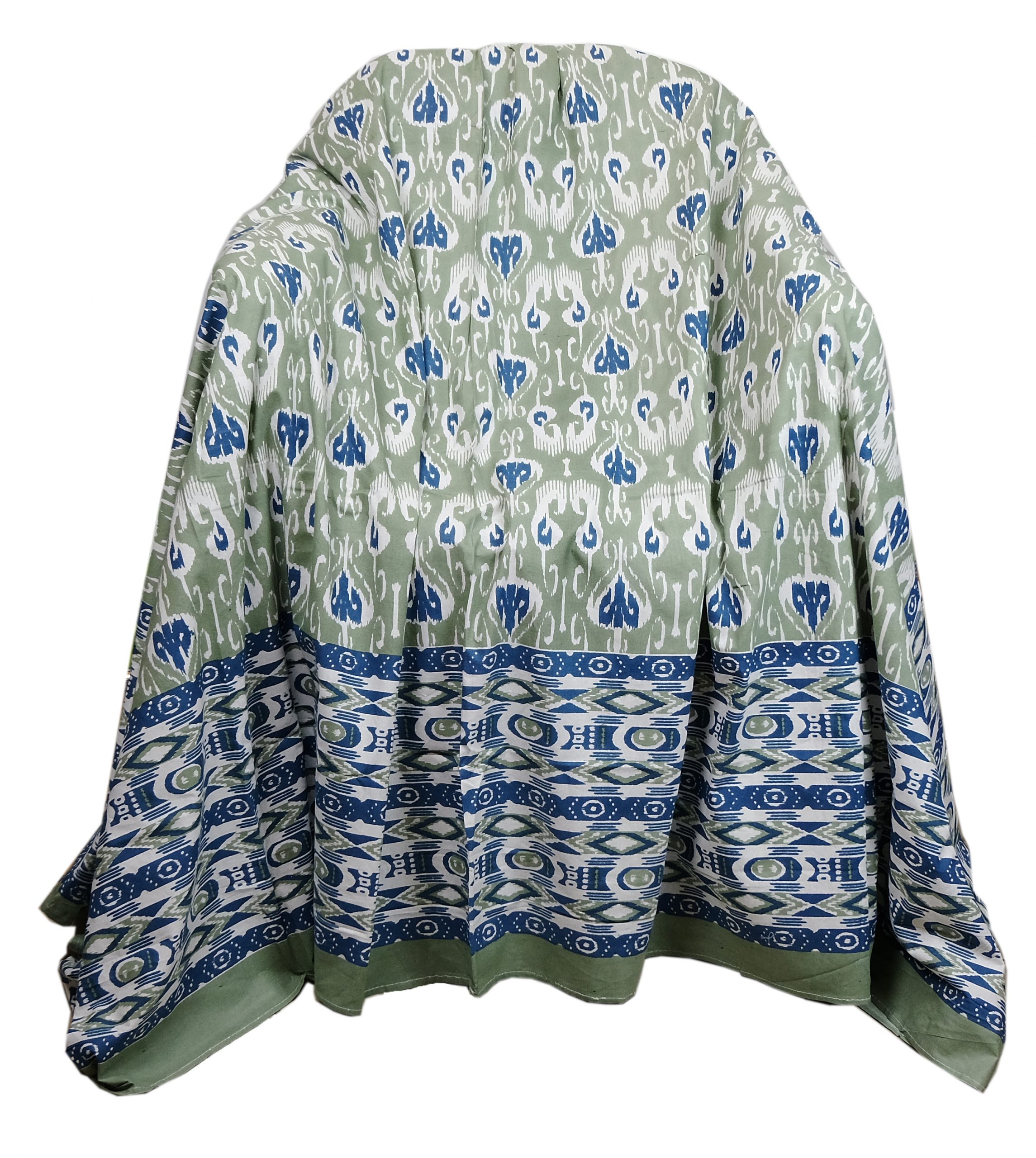Eine großzügige Druckdecke aus 100% Baumwolle. Das zarte Ikatmuster ist in Salbei-Blau gehalten. An den Rändern eine wunderschöne breite farblich abgestimmte und etwas dunkler gehaltene Abschlußbordüre. Geeignet ist dieses Produkt als Doppelbettdecke, Sofaüberwurf, Vorhang, Picknickdecke und vieles mehr! Mit einem Wort: ein praktischer Allrounder Maße: 228×260 cm. Maschinwäsche 60°.